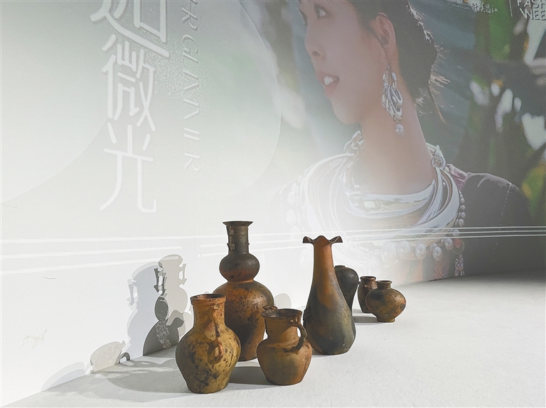 “这次的设计主题叫‘蝴蝶黎锦’系列,花了半年的时间进行设计和研发,大秀以非遗黎锦蝴蝶图腾为核心的特色元素进行设计,希望展现黎族女性从传统走到现代的多元化变化。”在PEARLSITGE中国珍珠设计品牌设计师沈君瑶眼里,秀场除了展示特别的黎锦设计之外,还有两大看点——牛皮凳与黎陶,这是不同的风格在舞台上交融。