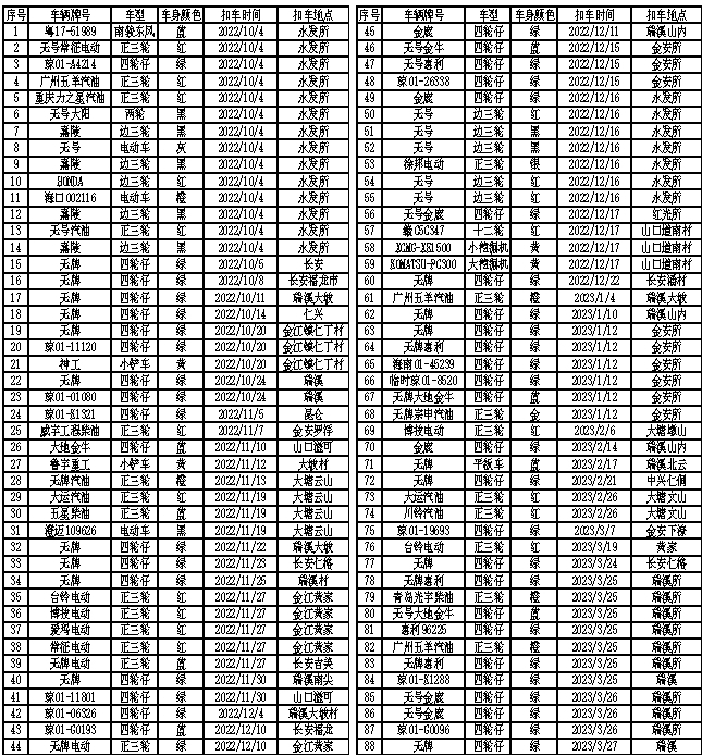 我县在2022年10月1日至2023年3月31日期间在澄迈县各乡镇执法检查过程中查处到涉嫌违法装载河砂的车辆及机具。因车辆和机具的所有权人不明,从本公告发布之日起一年内,请公告清单列表上的所有车辆和机具的所有权人携带个人身份证及其他证明车辆、机具来源材料到澄迈县综合行政执法局1楼县“多规合一”管控行政执法大队办理相关手续。逾期未认领的,我局将依法移送相关部门进行无主物的财产处置。办公室电话:0898-67615217,地址:海南省澄迈县金江镇金马大道党校一楼。