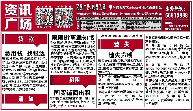 海口公司:国贸玉沙路椰城大厦一层,68541188、13307529219;三亚公司:三亚解放路第三市场旁,88558868、13518885998。