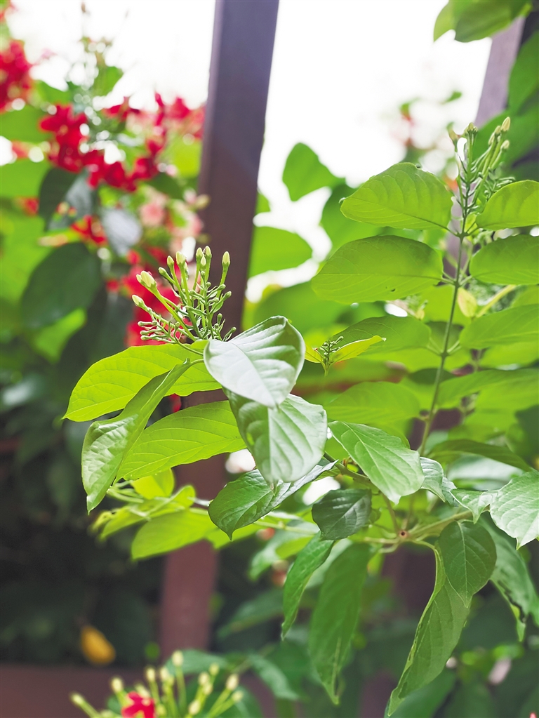 三亚崖州,田间小院,长长屋檐上,攀援而上的使君子,浸染了满目春意。