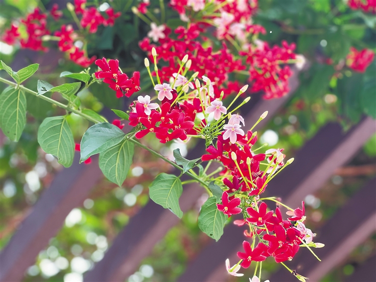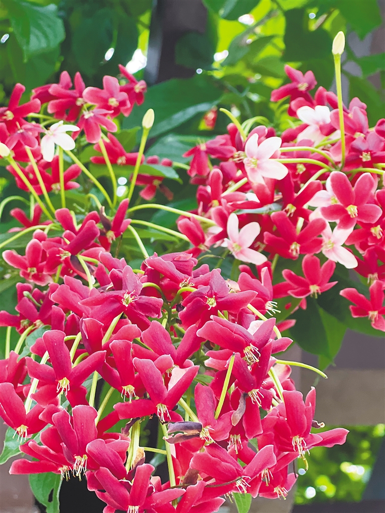 使君子是“善变”的花。开放中,使君子的花有色彩、朝向两种变化。初开时,花呈白色,且直立向上,一阵子后,变为深红而低垂。