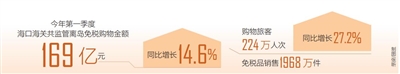 本报海口4月17日讯(记者周晓梦 通讯员吴昊 符太生 王纯豪)离岛免税市场持续“火热”。4月17日,海南日报记者从海口海关获悉,据该关统计,今年第一季度,海口海关共监管离岛免税购物金额169亿元,同比(下同)增长14.6%。购物旅客224万人次,增长27.2%,免税品销售1968万件。
