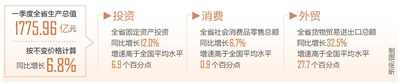 消费恢复,一季度,全省社会消费品零售总额同比增长6.7%,增速高于全国平均水平0.9个百分点;