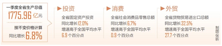 投资提速,一季度,全省固定资产投资同比增长12.0%,增速高于全国平均水平6.9个百分点;