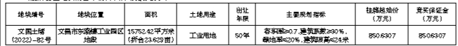 二、申请人的资格:中华人民共和国境内外的法人、自然人或其他组织(法律另有规定者除外)均可申请参加竞买(注:失信被执行人不得参与本次竞买),申请人应单独申请竞买。本次挂牌不接受联合体竞买,不接受竞买人电话、邮寄、电子、口头报价。申请人应具备的其他条件:(一)申请人须具备竞买条件,并按规定缴交土地竞买保证金,经过审核我局将在规定的时间内确认其资格,签发竞买资格确认书。(二)经政府相关部门核实,在文昌市境内申请人存在下列情形之一的,申请人及其控股股东禁止参加挂牌:1.存在伪造公文骗取用地和非法倒卖土地等犯罪行为的;2.存在非法转让土地使用权等违法行为的;3.因企业原因造成土地闲置一年以上的;4.开发建设企业违背出让合同约定条件开发利用土地的;5.拖欠土地出让金的。三、本次国有建设用地使用权挂牌出让设有底价,并按照出价最高且不低于底价者得的原则确定竞得人。四、本次挂牌出让的详细资料和具体要求,见挂牌出让文件。申请人可于2023年4月21日至2023年5月24日从海南省建设用地使用权和矿业权网上交易系统(以下简称网上交易系统,网址:http://lr.hainan.gov.cn:9002)查看和打印或从文昌市自然资源和规划局自然资源权益和开发利用室或海口市龙华区龙华路23号万国中央区逸景阁2001房领取纸质手册。并按挂牌出让手册的具体要求报名参加竞买。五、申请人交纳竞买保证金的截止时间为2023年5月24日17时00分(以竞买保证金到账为准)。经审核,申请人按规定交纳竞买保证金,具备申请条件的,我局将在2023年5月24日17时30分前确认其竞买资格。六、本次国有建设用地使用权挂牌活动定于2023年5月16日8时30分至2023年5月26日10时00分在海南省政府会展楼二楼省公共资源交易服务中心土地交易厅进行。(2023年5月26日10时00分在海南省政府会展楼二楼省公共资源交易服务中心土地交易厅召开挂牌现场会)。七、开发建设要求:(一)竞得土地后,竞得人须按照签订的《成交确认书》约定与文昌市自然资源和规划局签订《国有建设用地使用权出让合同》,在签订《国有建设用地使用权出让合同》之日起30日内付清全部土地出让价款。(二)本次出让宗地属工业项目用地。竞得该宗土地后,须严格按照批准的项目规划设计方案要求,以及有关部门的行业规定,在签订出让合同之日起三个月内动工建设项目,一年半内完成项目的投资建设。不按批准的项目规划设计要求进行开发建设和不在半年内动工建设项目的,由受让人向出让人支付相当于宗地出让价款 1‰的违约金。受让人不履行《国有建设用地使用权出让合同》约定的,报经市政府批准后,按该合同约定,退还除该合同约定的定金以外的全部或部分国有建设用地使用权出让价款(不计利息),收回国有建设用地使用权;受让人造成土地闲置,按照《海南自由贸易港闲置土地处置若干规定》执行。(三)本次出让宗地按净地条件出让,即土地权利清晰、安置补偿落实到位、地上附着物清表、无法律经济纠纷、土地开发利用规划条件明确,符合海南省政府(琼府〔2018〕3号)文件规定具备动工开发所必需条件。竞买人应当现场踏勘出让地块,竞买人申请参加竞买的,视为对出让地块的净地条件无异议,在竞得土地后,竞得人须同意与出让人按该净地条件签订《国有建设用地交地确认书》确认出让地块交地开发建设。(四)按照《关于印发〈海南省建设用地出让控制指标(试行)〉的通知》(琼国土资规〔2018〕7号)和《关于实施产业项目发展和用地准入协议的指导意见》(琼国土资规〔2018〕8号)有关规定,本次出让宗地工业用地控制指标,投资强度为不低于300万元/亩,不设定年度产值指标和年度税收指标,开发建设的项目产值和税收征缴按照现行有关法规政策规定执行,达产年限5年。以上控制指标及要求按规定列入《产业项目发展和用地准入协议》(文国土储〔2022〕-82号),属于协议内容的组成部分,竞得人在签订国有土地使用权出让合同时,一并与文昌市科学技术工业信息化局签订《产业项目发展和用地准入协议》(文国土储〔2022〕-82号)。(五)竞得土地后,竞得人拟在文昌市注册成立新公司进行开发建设的,申请人应在申请书中明确新公司的出资构成、成立时间等内容。(六)竞得土地后,竞得人须按规定完善该宗地施工报建、地质、压覆矿、消防、环保等审批手续,方可动工建设。(七)根据《文昌市住房和城乡建设局关于文国土储〔2022〕-82号地块建设项目装配式建造意见的复函》,该宗地的竞得方应采用装配式方式建造。八、其他需要公告的事项:(一)按照《海南省自然资源和规划厅关于海南省土地交易市场竞买保证金可使用银行保函的通知》(琼自然资规〔2022〕7号)要求,竞买人可使用银行保函方式缴纳竞买保证金,保函应为不可撤销、见索即付保函,保函担保金额应不少于全额土地竞买保证金,保函的保证期限应当自保函开立之日起至招标拍卖挂牌交易活动结束后不少于60日,保函需在保证金交纳截止时间前2个工作日内送达我局。(二)挂牌时间截止时,有除最高报价者外的其他竞买人表示愿意继续竞价,转入现场竞价,通过现场竞价确定竞得人。(三)本次挂牌出让事项如有变更,届时以变更公告为准。(四)本公告未尽事宜详见《文昌市国有建设用地使用权挂牌出让手册》,该手册所载内容为本公告的组成