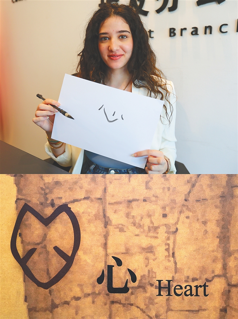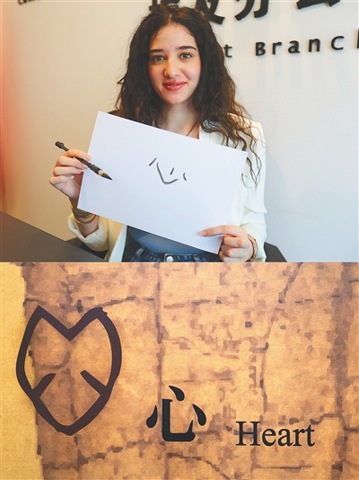 拼版照片:上图为2023年4月13日,在埃及开罗,阿斯玛·穆斯塔法·易卜拉欣展示用毛笔书写的“心”字;下图为2023年4月19日在位于中国河南省安阳市的中国文字博物馆拍摄的“心”字甲骨文(左)。
