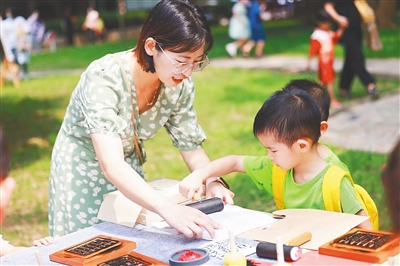 图为亲子家庭将喜欢的诗词印在宣纸上收藏。
