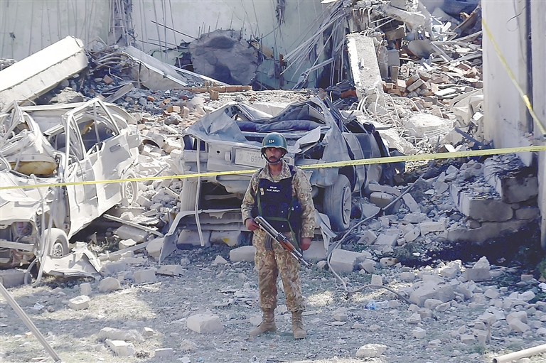 4月25日,在巴基斯坦斯瓦特地区,士兵在爆炸袭击现场执勤。