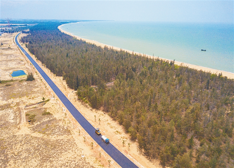 近日,海南环岛旅游公路东方段已现雏形,工人们正在进行沥青摊铺、绿化等施工。该路段主线全长74.3公里,是海南环岛旅游公路的重要组成部分。新华社记者 蒲晓旭 摄
