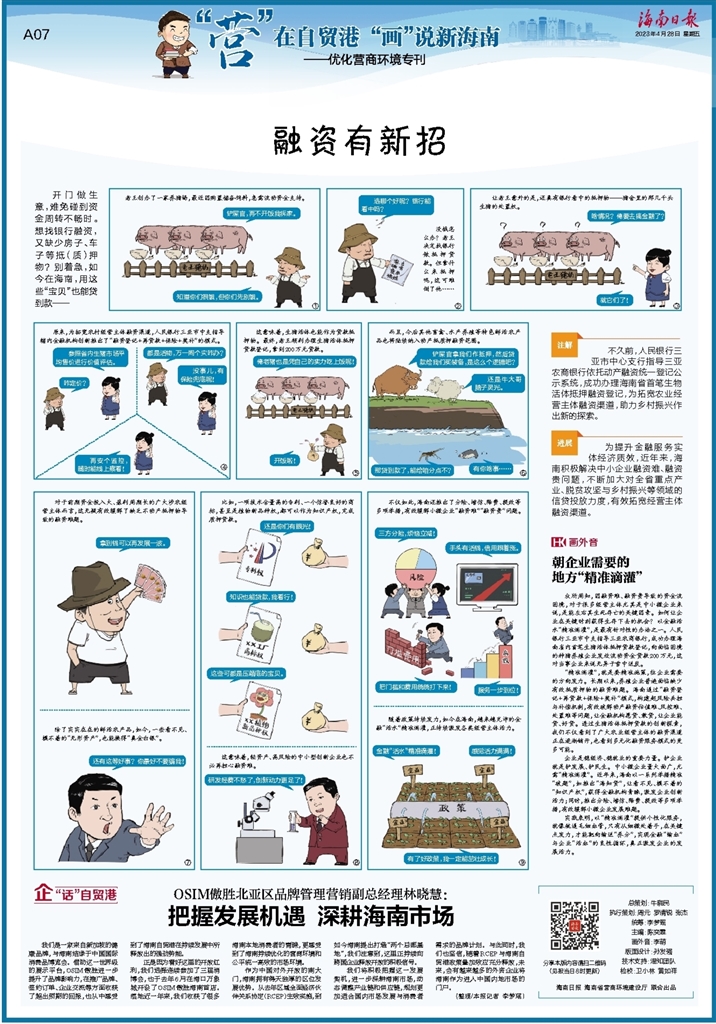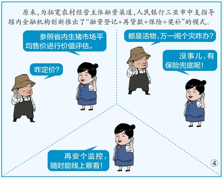 “精准滴灌”,就是要精准施策,往企业需要的方向发力。长期以来,养殖企业普遍面临缺少有效抵质押物的融资难题。海南通过“融资登记+再贷款+保险+奖补”模式,构建起风险共担与补偿机制,有效破解动产融资估值难、风控难、处置难等问题,让金融机构愿贷、敢贷,让企业能贷、好贷。透过生猪活体抵押贷款的创新探索,我们不仅看到了广大农业经营主体的融资渠道正在逐渐铺开,也看到多元化融资服务模式的更多可能。