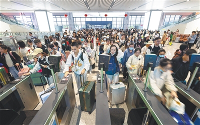 记者在上海虹桥站看到,人流如织,为服务保障旅客快速通行,站区在进站口开设携带小件物品旅客便捷通道,安检增设“双手检”,进一步缩短旅客进站时间。