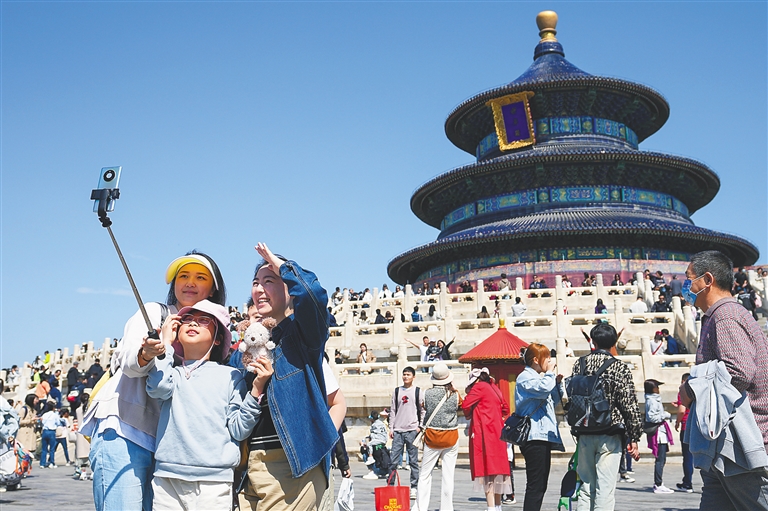 游客在北京天坛公园合影留念。 (本栏图片均由新华社发)