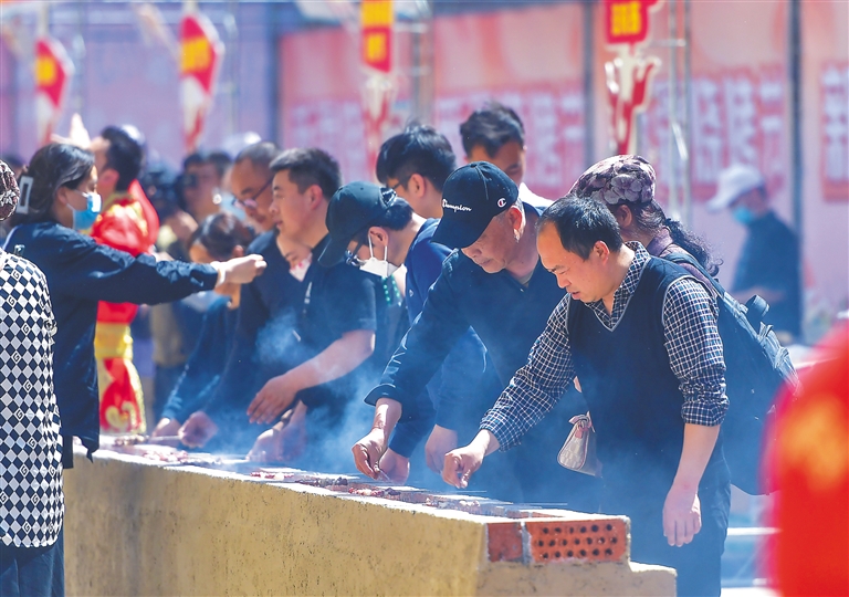 在新疆国际大巴扎烧烤体验区,游客在体验自助烧烤。