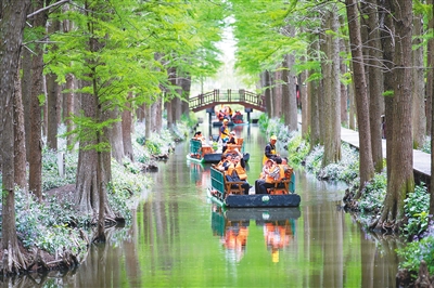 游客在江苏兴化水上森林游玩。