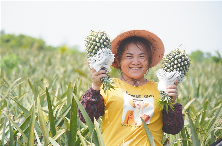 5月5日,在海口市美兰区大致坡镇美篆村菠萝种植基地,菠萝抢“鲜”上市,工人在田间地头采摘和展示菠萝。据了解,大致坡镇共种植超4300亩菠萝,在采收季,每天可提供许多个临时务工岗位,带动周边村民在家门口就业。本报记者 张茂 通讯员 王聘钊 图/文