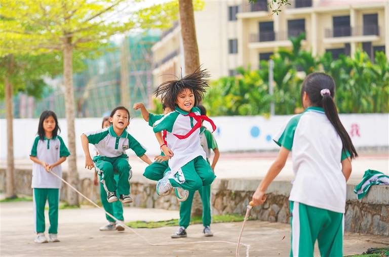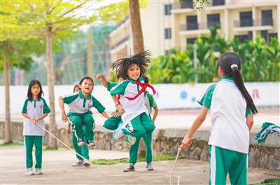 日前,在白沙黎族自治县白沙学校的体育课上,学生们在欢快地跳绳。
