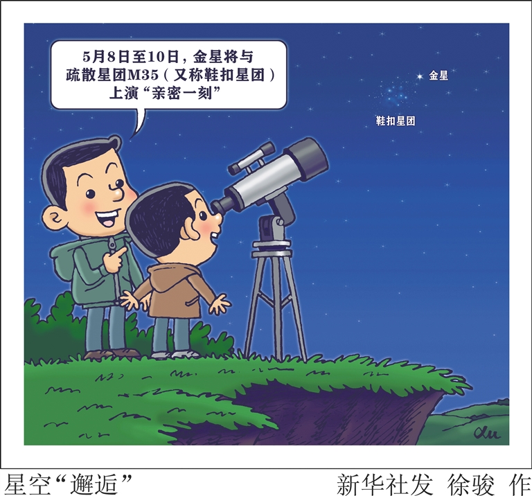 新华社天津5月7日电 (记者周润健)天文科普专家介绍,继4月10日至12日与疏散星团M45(又称昴星团)上演“擦肩而过”,5月8日至10日,明亮的金星又将与另外一个疏散星团M35(又称鞋扣星团)上演“亲密一刻”,这又是一次拍摄行星与深空天体相伴的机会。