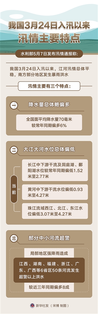 汛情通报称,我国3月24日入汛以来,江河汛情总体平稳,南方部分地区发生暴雨洪水,汛情主要有三个特点: