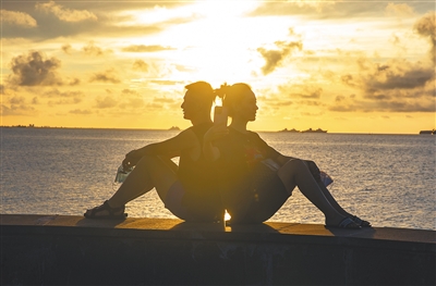 每年5月到8月,当太阳西沉入海,霞光将海面染成金黄色,你可以在海口湾一带感受到“海水共长天一色”的绝美意境。日落后,位于海边的各类特色主题餐厅、酒吧开始迎客,轻缓悠扬的布鲁斯等类型的音乐从店内传出,借风力飘到海面上,增添了几分浪漫气息。