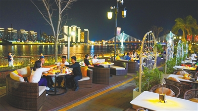 “从这里可以看到世纪大桥和海上日落,我们餐厅的创办者选址时,一眼就看中了这个位置。”海口湾外滩酒吧一条街一家主题餐厅的工作人员林智说,该餐厅是海口湾较早对外营业的餐饮企业,考虑到餐厅的位置、主要顾客群体、周边环境,他们推出了多种特色西餐、中餐、酒水,“在这里看夕阳、品美食,吹着海风喝点小酒,很惬意。”