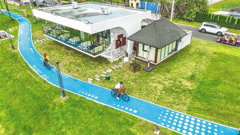 近日,在海南环岛旅游公路琼海博鳌段,市民游客在海滨小道和观景台上骑行、观光。