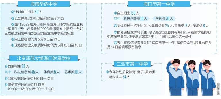 本报海口5月8日讯 (记者计思佳)海南日报记者获悉,日前,海南华侨中学、海口市第一中学、北京师范大学海口附属学校、三亚市第一中学等学校相继公布高一自主招生(含特长生)工作方案。考生和家长可以搜索各个学校官方微信公众号,了解招生计划、报考条件等信息,并进行网上报名。大部分学校自主招生考试时间定在5月下旬。