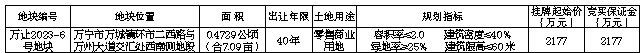二、竞买人资格及竞买要求:(一)竞买人资格:本次挂牌活动凡属中华人民共和国境内外的法人、自然人和其他组织(除法律另有规定者外)均可申请参加挂牌。属境外机构和个人(含港、澳、台地区)申请参与竞买的,按照规定需提交商务主管部门核发的《外商投资企业批准证书》和市场监督管理部门核发的《营业执照》。本次挂牌不接受联合竞买。失信被执行人不得参加本次项目竞买。(二)竞买要求:1.凡在万宁市境内已取得建设用地使用权且造成土地闲置的,或者拖欠土地出让金未缴的,均不具备竞买人条件。2.竞买人需在签订《成交确认书》后与万宁市商务局签订《海南省产业项目发展和用地准入协议》,并严格按照《海南省产业项目发展和用地准入协议》约定内容进行开发建设,否则将承担相关违约责任。三、本次国有建设用地使用权挂牌出让设有底价,按照出价最高且不低于底价的原则确定竞得人。四、竞买咨询及报名期限:本次挂牌出让的详细信息和具体要求,见挂牌出让手册及其他相关文件。手册和文件可从海南省建设用地使用权和矿业权网上交易系统(以下简称网上交易系统,网址:http://lr.hainan.gov.cn:9002)查看和打印。竞买人持CA数字证书实名登录网上交易系统进行相关操作,系统注册及证书办理详见《海南省建设用地使用权和矿业权网上交易系统用户手册》。挂牌出让文件所载内容亦为本公告的组成部分。本次国有建设用地使用权实行网上挂牌出让,有意向的竞买人可登录网上交易系统提交竞买申请,按要求上传竞买申请文件。竞买保证金缴纳截止时间:2023年6月7日17:00(以银行系统记录到账时间为准)。 竞买申请时间:2023年5月9日08:30至2023年6月7日17:00(以网上交易系统服务器时间为准,下同)。五、资格确认:经审查,申请人按规定交纳竞买保证金,具备申请条件的,我局将在2023年6月7日17:30前确认其竞买资格,网上交易系统自动发放《竞买资格确认书》。六、挂牌报价时间及地点:网上挂牌时间:起始时间:2023年5月30日08:30;截止时间:2023年6月9日09:30。网上挂牌地点:海南省建设用地使用权和矿业权网上交易系统(网址:http://lr.hainan.gov.cn:9002)。 网上挂牌报价时间截止时,无竞买人报价,挂牌活动自动结束;有竞买人报价,网上交易系统限时5分钟在线询问,有竞买人在此规定时限内表示愿意参与网上限时竞价的,系统自动进入网上限时竞价程序,以竞价方式确定竞得人。七、开发建设要求:(一)该地块已经达到下列净地条件:安置补偿落实到位,土地权利清晰;不存在土壤污染,符合土壤环境质量要求;确认通水、通电、通路等,具备动工开发必需的条件;无法律经济纠纷。(二)经查询全国污染地块土壤环境管理系统,该地块不在系统污染或疑似污染地块范围内。用地如涉及压覆重要矿产及位于地质灾害易发区,在该地块内进行项目建设依法需办理建设项目压覆矿产资源审批手续及地质灾害危险性评估的,应按规定办理相关手续。(三)土地出让控制指标:旅馆用地投资强度指标应为≥300万元/亩,年度产值指标应为≥450万元/亩,年度税收指标应为≥12万元/亩。该控制指标参照《海南省自然资源和规划厅 海南省发展和改革委员会 海南省农业农村厅 海南省工业和信息化厅 海南省商务厅 海南省财政厅 国家税务总局海南省税务局关于印发<海南省产业用地控制指标>的通知》(琼自然资用〔2023〕12号)文件确定。项目达产时间为签订《国有建设用地使用权出让合同》后的3年内。以上出让指标列入《海南省产业项目发展和用地准入协议》,属该协议内容的组成部分。(四)该宗地须按照我省商业、办公类建设项目管理要求进行开发建设,不得兴建“类住宅”项目,不得采用住宅套型设计,套内建筑不得设置独立厨房、卫生间、排水排烟等设施,具体按照《海南省自然资源和规划厅 海南省住房和城乡建设厅 海南省市场监督管理局关于加强商业、办公类建设项目全过程管理的意见》(琼自然资规〔2021〕12号)执行。(五)装配式建造方式应按照《海南省住房和城乡建设厅 海南省发展和改革委员会 海南省自然资源和规划厅 海南省市场监督管理局 海南省工业和信息化厅关于进一步稳步推进装配式建筑有关事项的通知》(琼建科函〔2021〕155号)等文件要求执行。八、其他需要公告的事项:(一)本次挂牌出让活动采取线上进行,不接受电话、信函、邮寄、电子邮件及口头竞买申请。(二)按照《海南省自然资源和规划厅关于海南省土地交易市场竞买保证金可使用银行保函的通知》(琼自然资规〔2022〕7 号)要求,竞买人可使用银行保函方式缴纳竞买保证金,保函应为不可撤销、见索即付保函,保函担保金额应不少于全额土地竞买保证金,保函的保证期限应当自保函开立之日起至招标拍卖挂牌交易活动结束后不少于60日,保函需在保证金交纳截止时间前2个工作日内送达我局。(三)受理时间:08:30~12:00,14:00~17:30(节假日除外)。(四)本次挂牌出让事项如有变更,届时以变更公告为准。(五)上述所有时间均为北京时间。九、咨询方式:联系地址:万宁市万城镇望海大道南侧万宁市自然资源和规划局;咨询电话:0898-62217899;联 系 人:梁先生;查询网址:http://zw.hainan.gov.cn/ggzy/;http://lr.hainan.gov.cn;http://www.landchina.com。