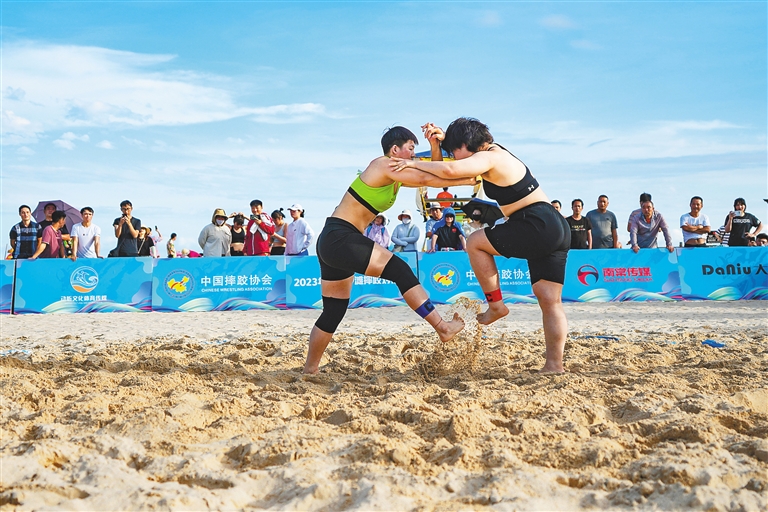 5月11日,2023年全国沙滩摔跤对抗赛在三亚大东海开赛。这是我国首次举办的全国性沙滩摔跤对抗赛事,来自北京、河北、山西、黑龙江等18个省市的18支代表队参赛。图为女子组选手在比赛。