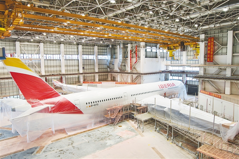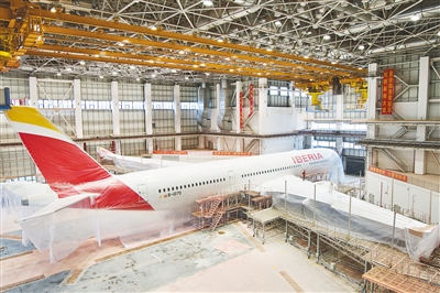 这是该基地投产以来承接的首单空客A350机型飞机整机喷涂业务。完成喷涂后,飞机将飞往西班牙首都马德里完成交付。本报记者 袁琛 通讯员 张健 图/文
