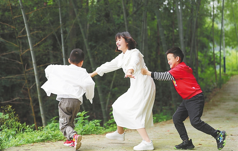 5月13日,在贵州省黔东南苗族侗族自治州岑巩县思旸镇龙江村,一位母亲与两个儿子做游戏。