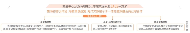 交易中心分为两期建设,总建筑面积超3.4万平方米,计划打造集海钓游玩体验、海鲜美食盛宴、海洋文旅展示于一体的渔旅融合商业综合体。目前,一期改造项目已完成建设,二期主要针对完善休闲渔业业态,借助国家级渔港经济区建设,融合渔业一二三产,打造三亚西部的娱乐综合体,吸引全国乃至全球游客体验琼岛特色的“渔业+旅游”,丰富我省旅游业态,吸纳更多就业,提高百姓收入,为当地创造更多产值。