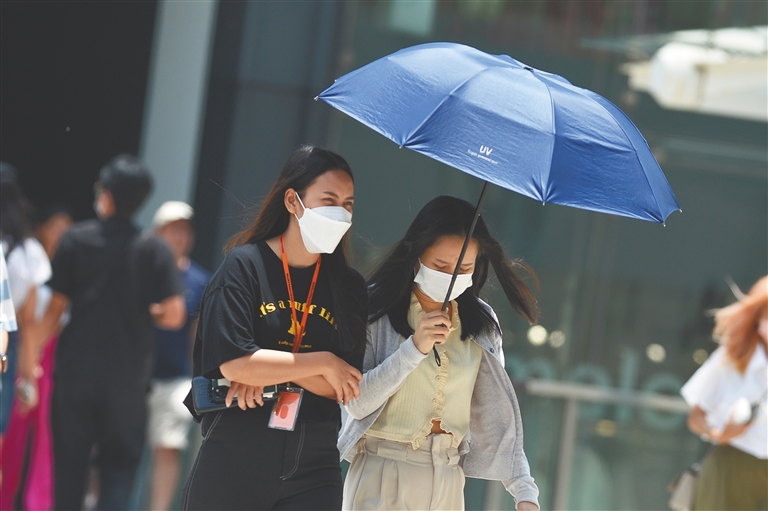 5月17日,行人在泰国曼谷街头用伞遮阳。