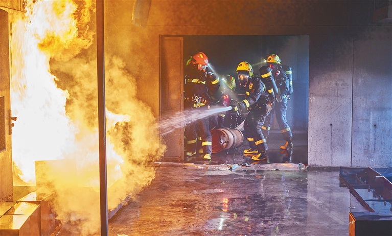 5月18日,海南省消防救援总队进入指挥员及站级作战力量对抗比武进入第四天。当天举行了我省消防系统全新比武考核科目——战级整建制科目:在灭火进攻、堵截火势、火场供水等13个火灾扑救作战环节中设置若干个具体任务点,重点考核消防员临机指挥、统筹协调、独立攻坚和协同配合能力。图/文 本报记者 封烁 通讯员 罗科凯