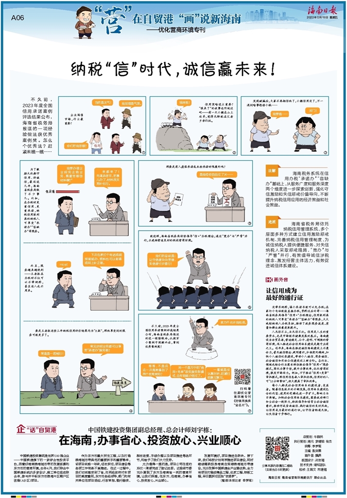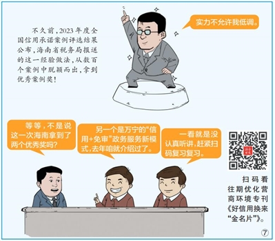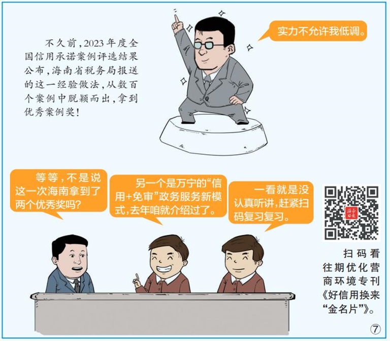人无信不立,业无信不兴。信用是人生的重要资本,也是市场经济健康发展的基石。海南建设自由贸易港,营造稳定、公平、透明、可预期的营商环境,深入推进社会信用体系建设是题中应有之义。近年来,海南在推进诚信海南建设上不遗余力,普及诚信理念、规则意识,弘扬契约精神,加快个人诚信记录建设,带动个人诚信、商务诚信、社会诚信和司法公信建设迈上新台阶。各行业、领域也结合行业需求特征推出倡导“信用+”服务模式,简化办事手续,提升办事效率,优化营商环境,激发市场活力。例如,万宁推出“信用+免审”审批模式,将信用信息嵌入审批流程,信用好的人可“10分钟拿证”,极大提高了审批效率。