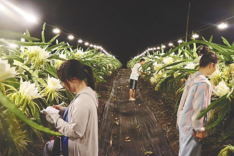 每周,周兵辉和谷萌都会像这样给火龙果施肥,隔一段时间再记录施肥后的植株出花率、产量和大果率。他们通过产量对比,不断调整肥料配比与施肥方案,得出投入与产出的最优比例。