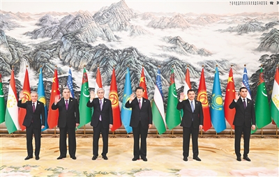 中亚五国元首相继抵达。习近平同五国元首亲切握手并集体合影。