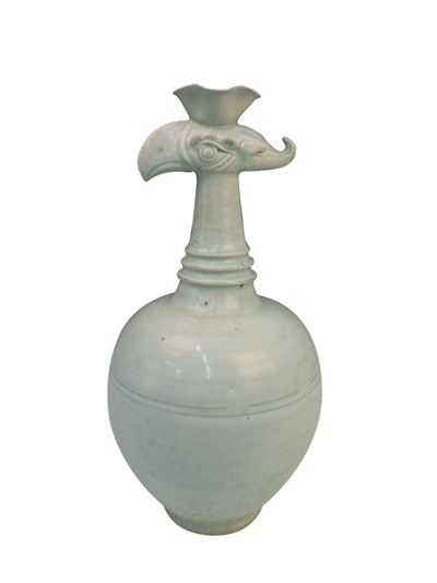 另一件馆藏之宝宋代青白釉花口凤首壶是宋代景德镇窑青白釉瓷器中的精品,其造型是受唐代波斯金银器风格影响演变而来。其通高40厘米,足径约10厘米,胎质洁白细腻,釉色莹润,青中泛白,白中透青,看起来很像青白玉。壶口盛开着四瓣花图案,象征凤冠,在颈部的下部和腹部,分别装饰了几道凸弦纹和凹弦纹。