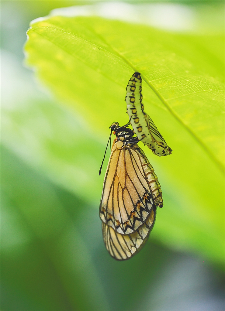 海南热带雨林国家公园的荨麻科植物上,有时会出现一种外表遍布尖刺的昆虫。初次见它的访客很难将它与美丽的苎麻珍蝶联系起来,而实际上,它们处于同一物种的不同发育阶段。