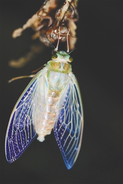 地下蛰居数年,蝉的若虫感知到夏天的信号,用强壮有力的开掘前足挖呀挖。冲出湿润的泥土,它迫不及待地爬到树上,来一次华丽的蜕变,进入生命的最后一个阶段——成虫。