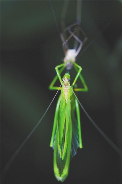 在五指山热带雨林的另一处,夜色掩盖下,一只螽斯悬吊在蜕去的外皮上。翅膀逐渐伸展长硬,它将迎来生命里的第一次飞翔。