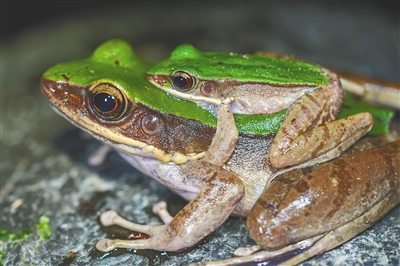 完成蜕变的蝴蝶、蜻蜓、蚂蚱等昆虫稍不注意,就会被蛙类长长的舌头击中,提前结束生命里最美丽的阶段。蛙的眼球大而突出,视野开阔,一旦有活动的昆虫出现,它都能发现并立即瞄准目标,飞身跃起或探身前移捕食。