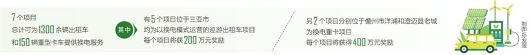 这7个项目总计可为1300余辆出租车和150辆重型卡车提供换电服务,其中有5个位于三亚市,均为以换电模式运营的巡游出租车项目,每个项目将获200万元奖励;另两个项目分别位于儋州市洋浦和澄迈县老城,为换电重卡项目,每个项目将获得400万元奖励。