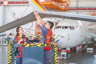 图为5月22日,在海南自贸港一站式飞机维修产业基地,工作人员在作业。图/文 本报记者 袁琛 通讯员 张健