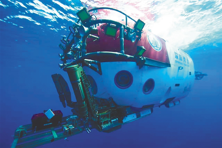 5月20日,蔚蓝的海面上,红白相间的“深海勇士”号载人潜水器缓缓沉入水下。