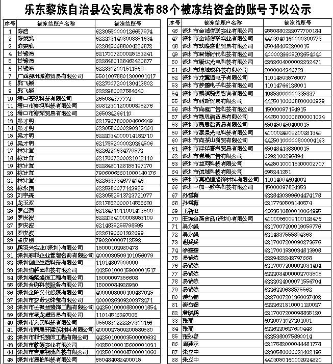 海南省乐东黎族自治县公安局在侦办一起非法经营案件中,依法冻结涉案账户88个,现上述账户里的资金来源不明。依据《中华人民共和国刑事诉讼法》《公安机关办理刑事案件程序规定》等相关法律规定,上述账户内被冻结资金的所有人在公告之日起一个月内主张权利并提交本人身份证件及相关资金来源合法有效证明材料到乐东黎族自治县公安局经济犯罪侦查大队,资金来源合法的,将依法返还当事人。