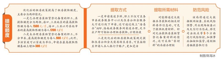 一是已办理房屋租赁登记备案的职工,其提取额度分为两档,海口、三亚地区的最高提取限额为每人1500元/月,海口、三亚以外其他市县的最高提取限额为每人1200元/月
