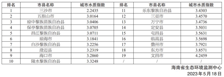 19个市县水环境质量按由好至差排名分别为:三沙市、五指山市、琼中黎族苗族自治县、保亭黎族苗族自治县、昌江黎族自治县、琼海市、白沙黎族自治县、澄迈县、海口市、陵水黎族自治县、乐东黎族自治县、三亚市、万宁市、定安县、屯昌县、临高县、儋州市、东方市、文昌市。详见右表: