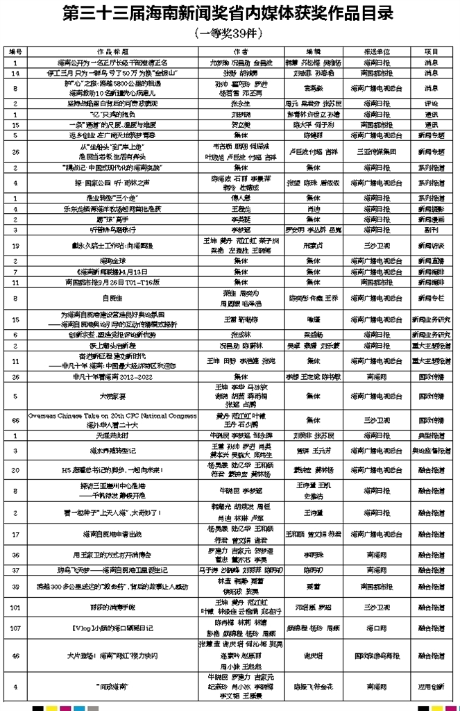 第三十三届海南新闻奖获奖作品目录