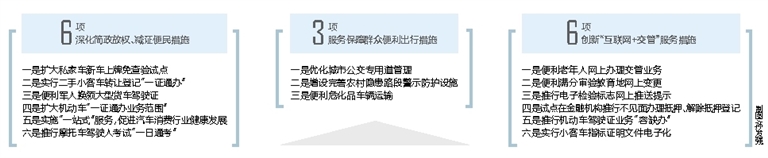 6项深化简政放权、减证便民措施:一是扩大私家车新车上牌免查验试点。新增21个城市18家生产企业试点新车出厂时查验车辆。二是实行二手小客车转让登记“一证通办”。三是便利军人换领大型货车驾驶证。四是扩大机动车“一证通办业务范围”。五是实施“一站式”服务,促进汽车消费行业健康发展。六是推行摩托车驾驶人考试“一日通考”。