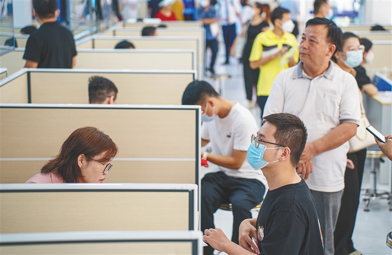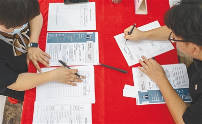 洽谈 求职者和用人单位工作人员洽谈。 图/文 本报记者 袁琛 实习生 张永卓